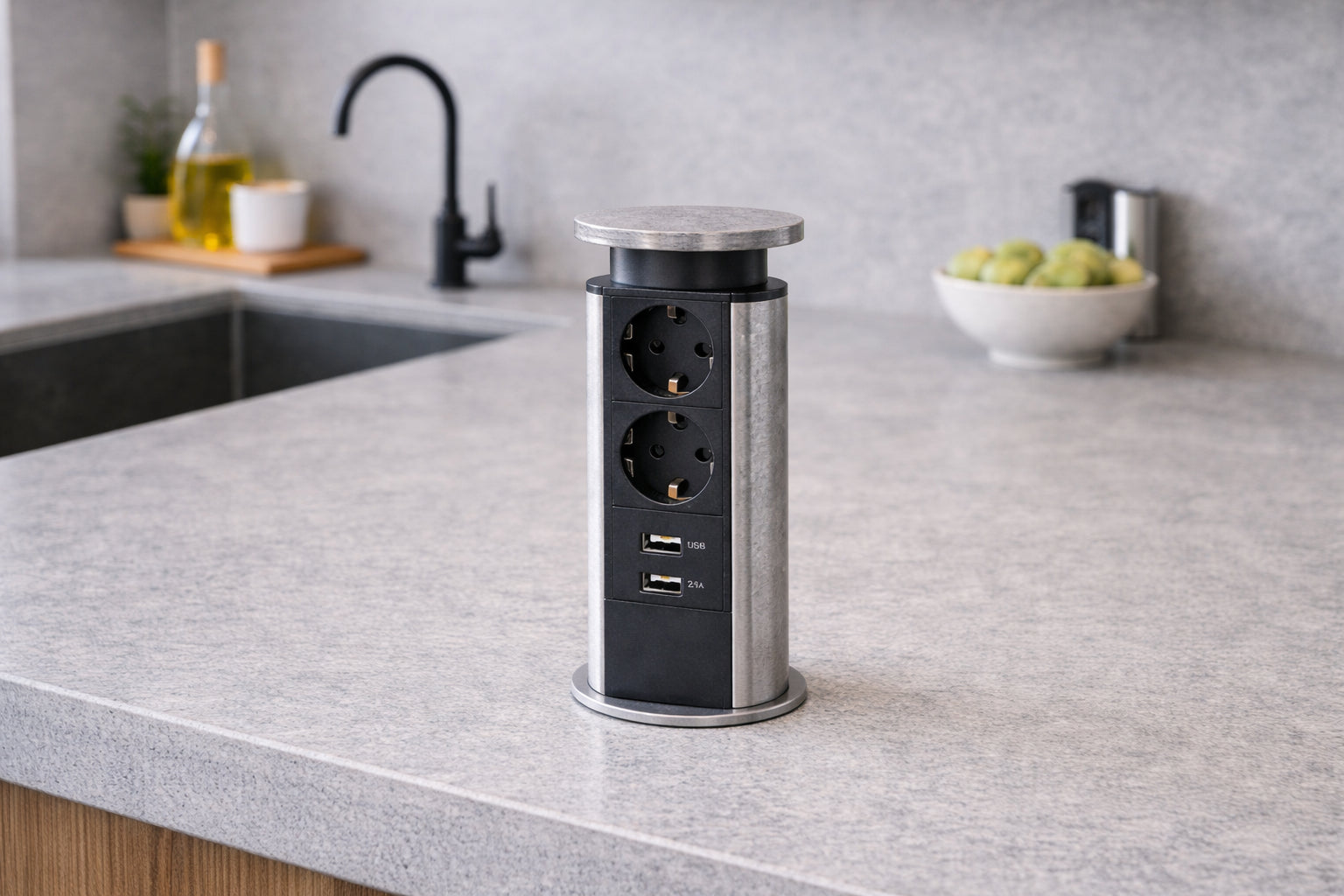 פופ־אפ עגול המוטמע כחלק מחיפוי השיש במשטח העבודה, ונשלף רק כשצריך.