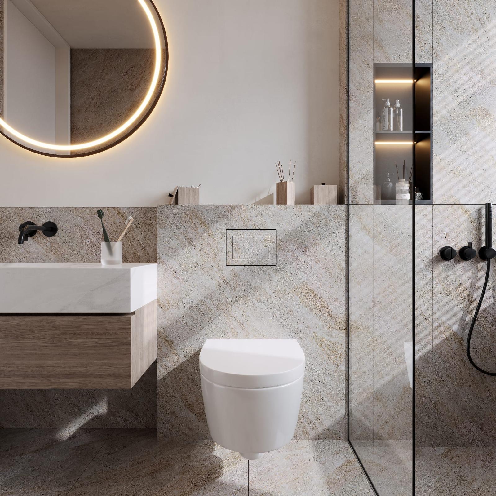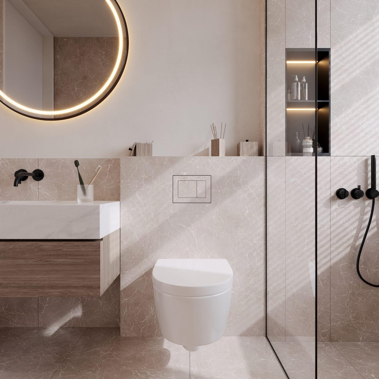 לחצן המותקן כחלק בלתי נפרד מחיפוי הקיר, מתחפה באותו חומר ויוצר מראה אחיד, נקי וכמעט בלתי נראה.